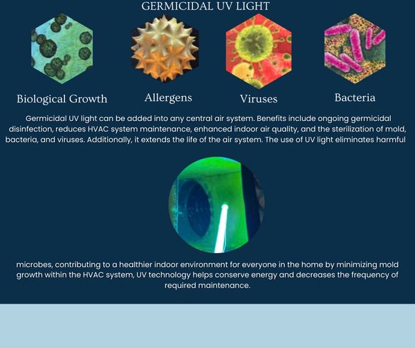 Ultraviolet lamps are installed within ductwork near HVAC systems and operate continuously. UV systems are effective in controlling bacteria and viruses. These lamps emit ultraviolet radiation through specialized bulbs designed to alter the DNA of microorganisms, thereby improving air quality. Clean air contributes significantly to overall health. For further information schedule a preventive maintenance inspection (PMI) our technicians will inspect your ducts and air handler for mold and growth.